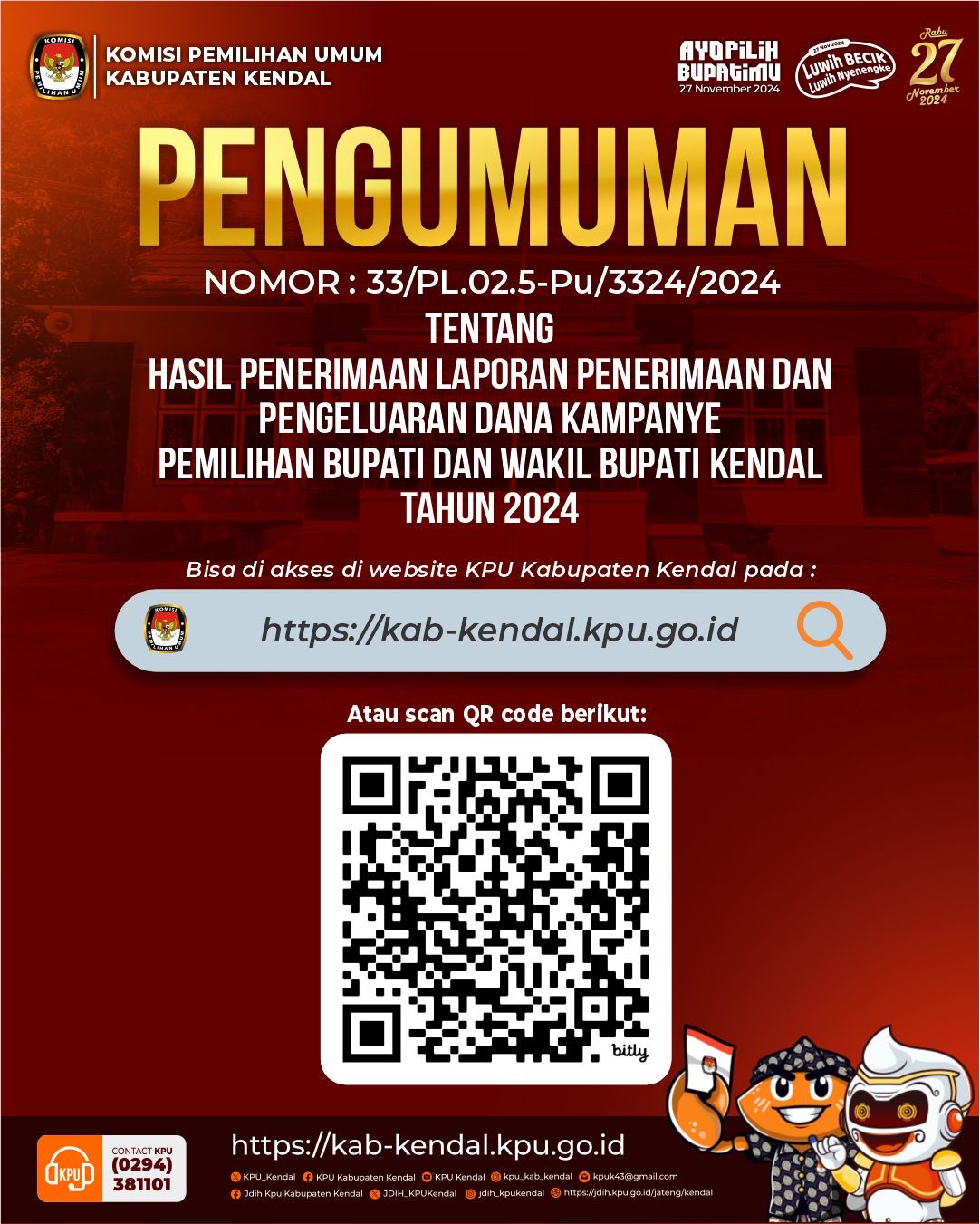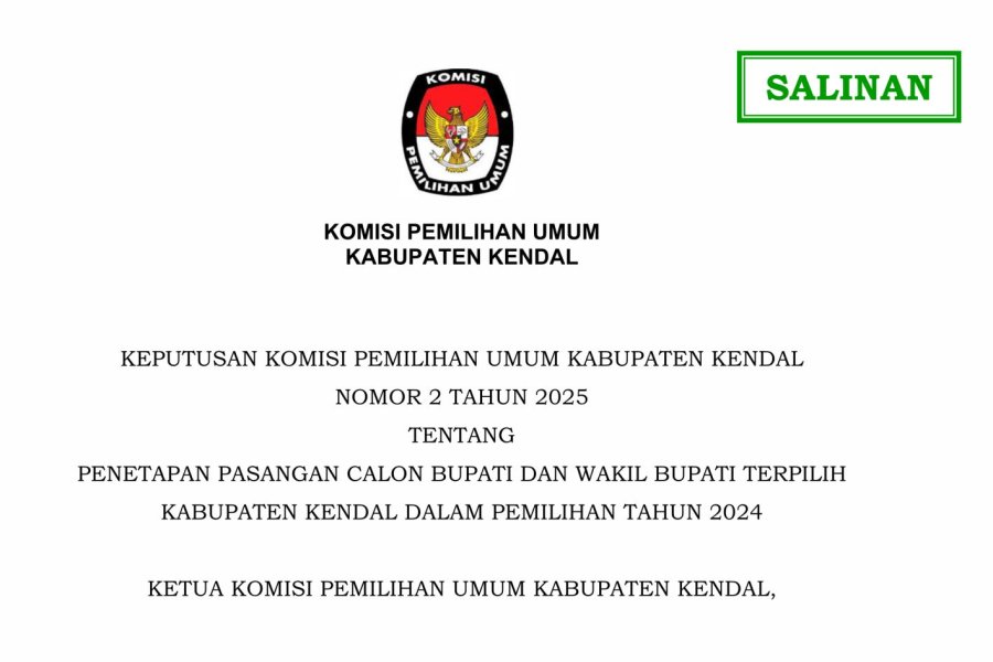 Menetapkan Pasangan Calon Bupati dan Wakil Bupati Kabupaten Kendal Nomor Urut 1 (Satu) Sdri. Hj. DYAH KARTIKA PERMANASARI, S.E., M.M. dan Sdr. H. BENNY KARNADI, S.Ag. dengan perolehan suara sebanyak 220.924 (dua ratus dua puluh ribu sembilan ratus dua puluh empat) suara atau 37,29% (tiga puluh tujuh koma dua puluh sembilan persen) dari total suara sah, sebagai Pasangan Calon Bupati dan Wakil Bupati Terpilih Kabupaten Kendal dalam Pemilihan Bupati dan Wakil Bupati Kabupaten Kendal Tahun 2024 Penetapan Pasangan Calon Bupati dan Wakil Bupati Kabupaten Kendal sebagaimana dimaksud dalam Diktum KESATU ditetapkan dan sekaligus sebagai pengumuman pada hari Kamis tanggal Sembilan bulan Januari tahun 2025 pukul 14.30 WIB (Waktu Indonesia Barat). Isi Lengkap Surat Keputusan KPU dapat di Lihat DISINI