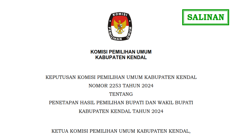 KEPUTUSAN KOMISI PEMILIHAN UMUM KABUPATEN KENDAL TENTANG PENETAPAN HASIL PEMILIHAN BUPATI DAN WAKIL BUPATI KABUPATEN KENDAL TAHUN 2024 Menetapkan Hasil Pemilihan Bupati dan Wakil Bupati Kabupaten Kendal Tahun 2024 berdasarkan hasil rapat pleno rekapitulasi penghitungan perolehan suara yang tertuang dalam formulir MODEL D.HASIL KABKO-KWK-BUPATI/WALIKOTA sebagaimana tercantum dalam Lampiran Keputusan yang merupakan bagian tidak terpisahkan dari Keputusan ini. Menetapkan Hasil Pemilihan Bupati dan Wakil Bupati Kabupaten Kendal Tahun 2024 dengan perolehan suara sebagai berikut KLIK DISINI