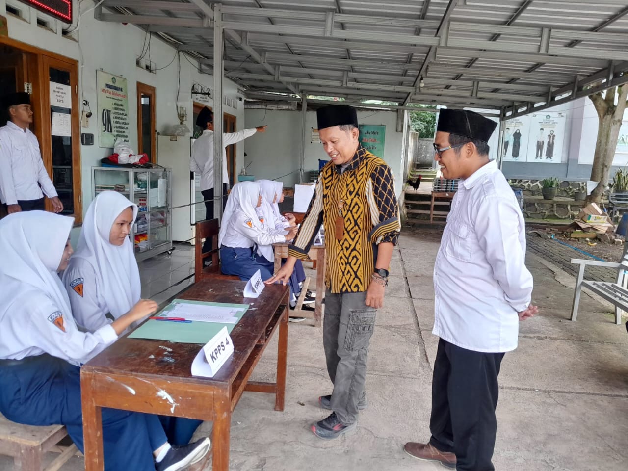 Setelah kegiatan apel, Didin Riswanto bersama pihak sekolah meninjau area tempat pemungutan suara (TPS) yang akan digunakan dalam pemilihan internal tersebut guna memastikan kesiapan sarana dan memberikan contoh mekanisme pemilihan yang sesuai prosedur. (HumasKPUKendal)