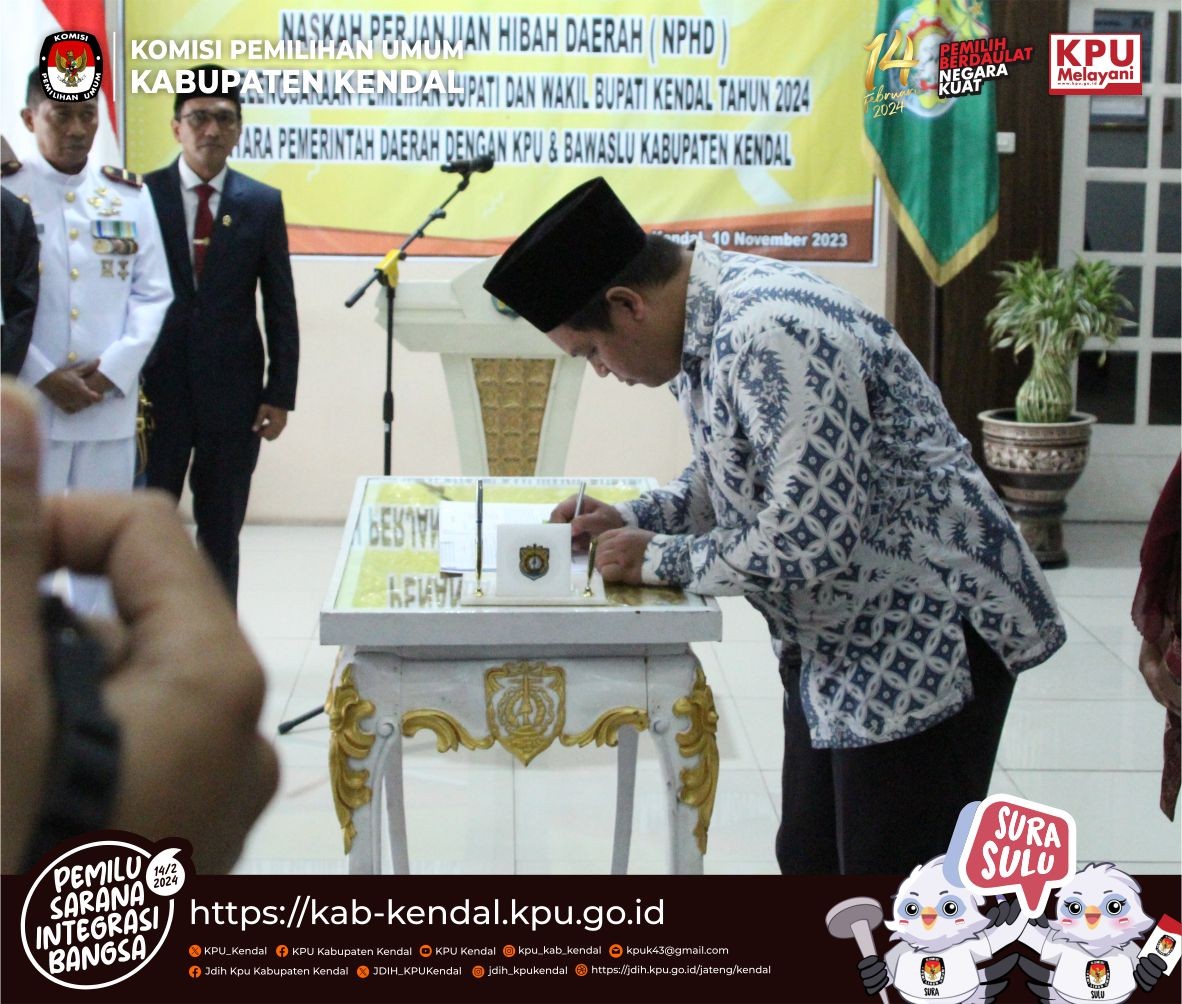 Jumat (10/11) Komisi Pemilihan Umum (KPU) Kabupaten Kendal dan Bawaslu Kabupaten Kendal bersama Pemerintah Daerah Kabupaten Kendal melaksanakan penandatanganan Naskah Perjanjian Hibah Daerah (NPHD) Penyelenggaraan Pemilihan Bupati dan Wakil Bupati Kendal Tahun 2024.