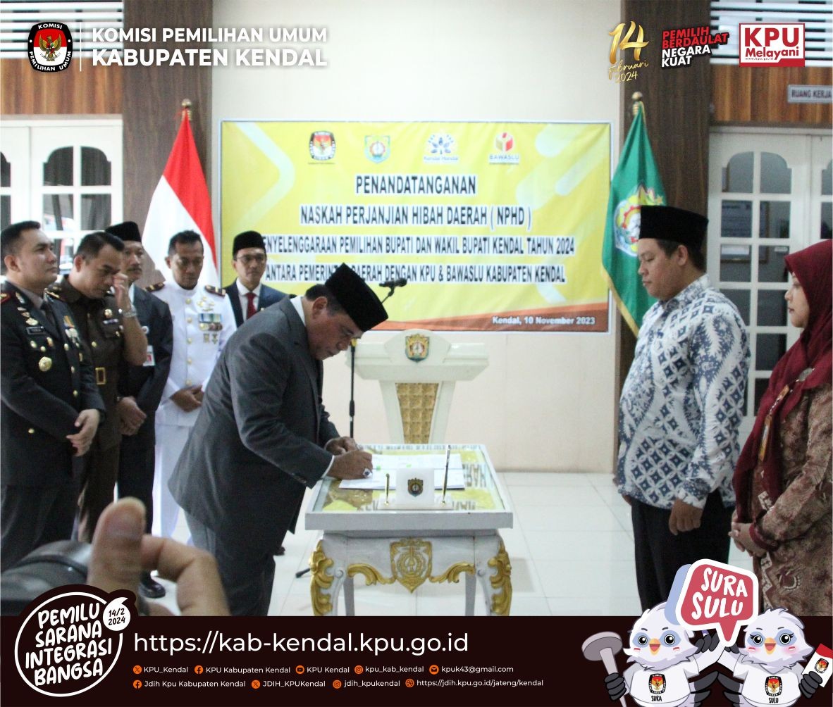 Penandatanganan NPHD yang berlangsung di Ruang Paringgitan Pendopo Kabupaten Kendal dilakukan oleh Ketua KPU Kabupaten Kendal, Khasanudin dengan Wakil Bupati Kendal, Windu Suko Basuki dan disaksikan oleh Jajaran Forkopimda Kabupaten Kendal. Pada kesempatan kali ini Bupati Kendal berhalangan hadir dan diwakilkan oleh Bapak Windu Suko Basuki selaku Wakil Bupati Kendal melakukan paraf pada Naskah Perjanjian Hibah Daerah (NPHD).