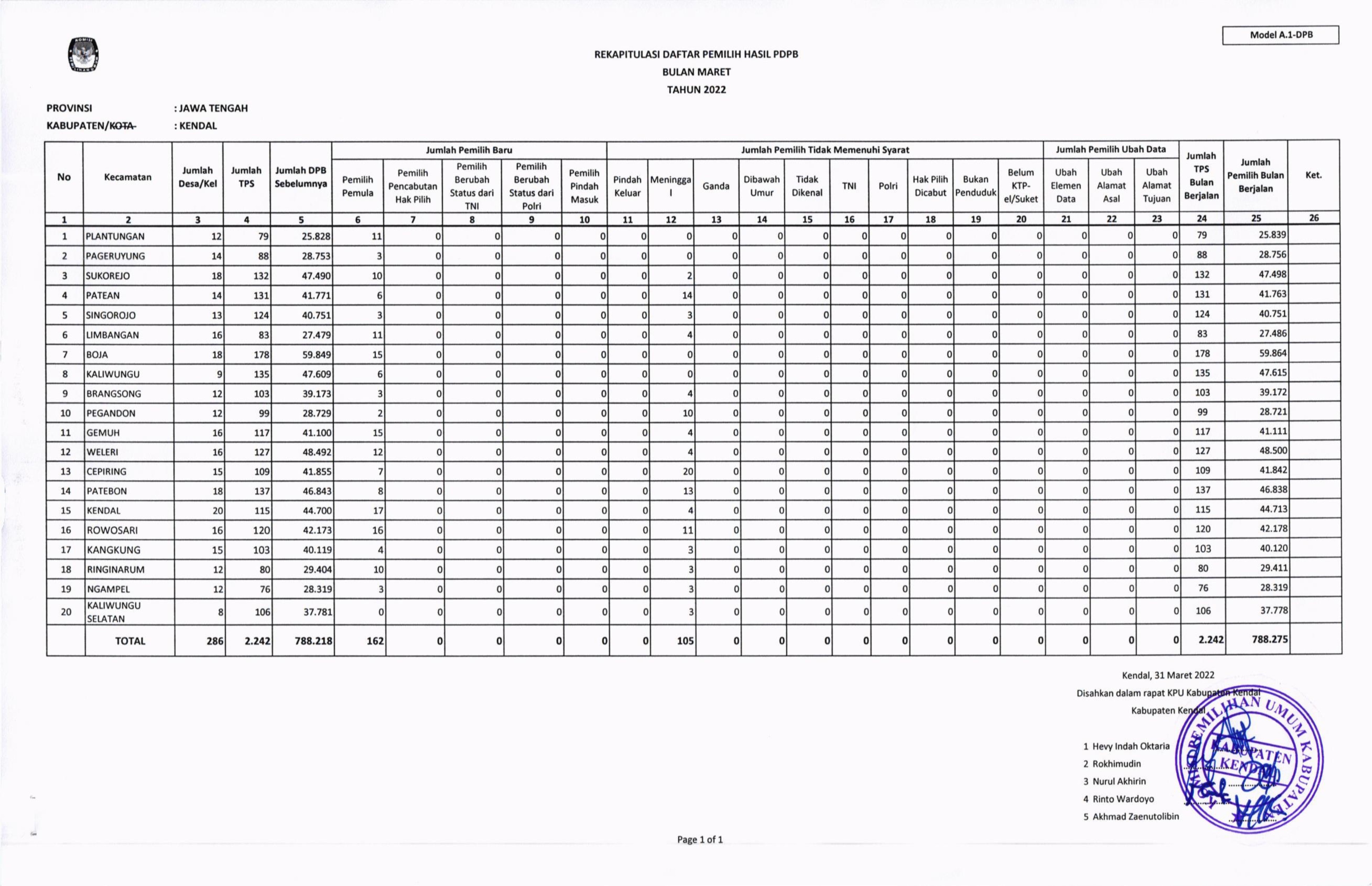 Bersama ini kami sampaikan pengumuman hasil Rekapitulasi Pemutakhiran Daftar Pemilih Berkelanjutan Bulan Maret Tahun 2022 sebagai tidak lanjut Pasal 25 Peraturan KPU No 6 Tahun 2001.