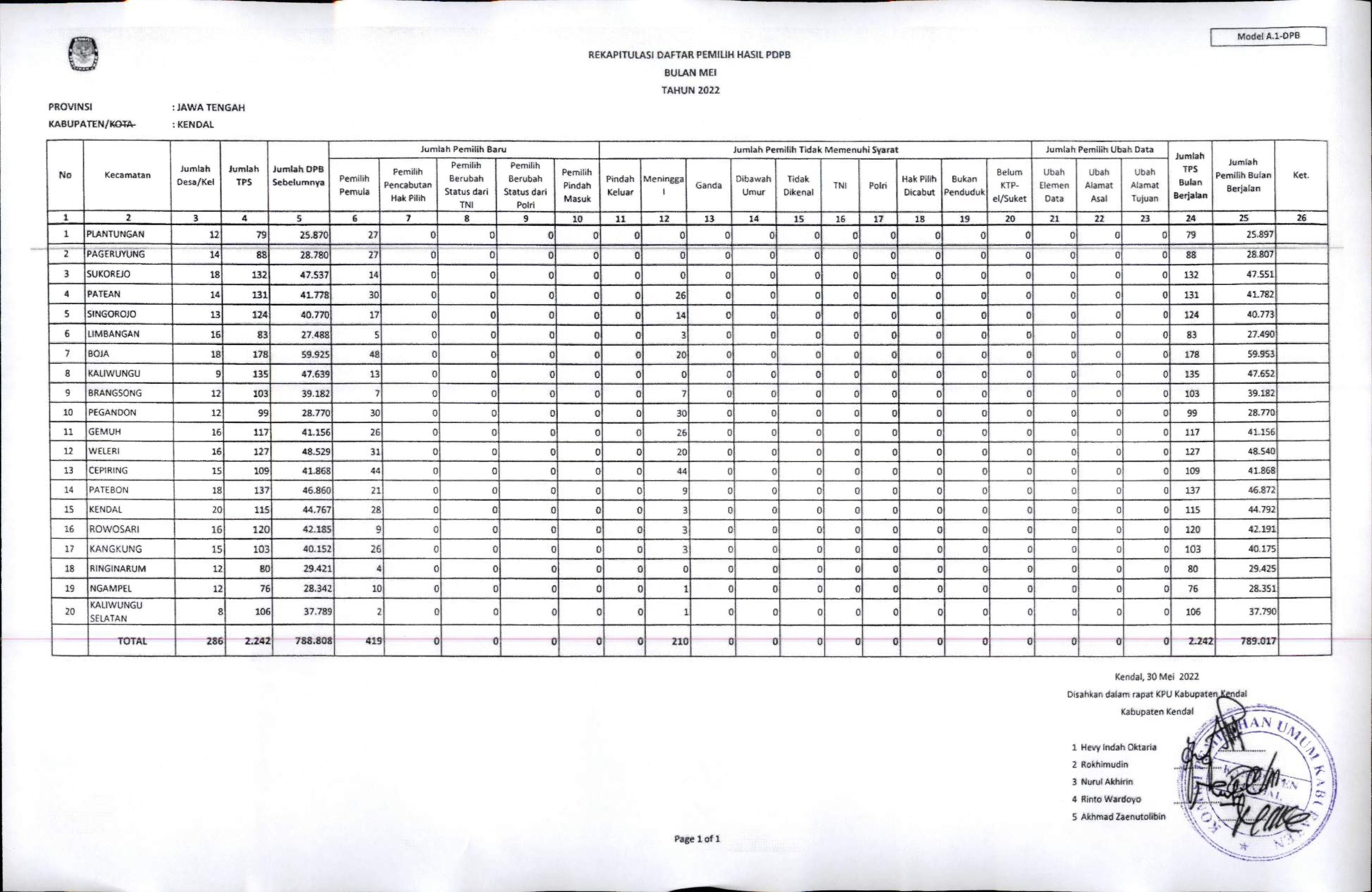 Bersama ini kami sampaikan pengumuman hasil Rekapitulasi Pemutakhiran Daftar Pemilih Berkelanjutan Bulan Mei Tahun 2022 sebagai tidak lanjut Pasal 25 Peraturan KPU No 6 Tahun 2001.