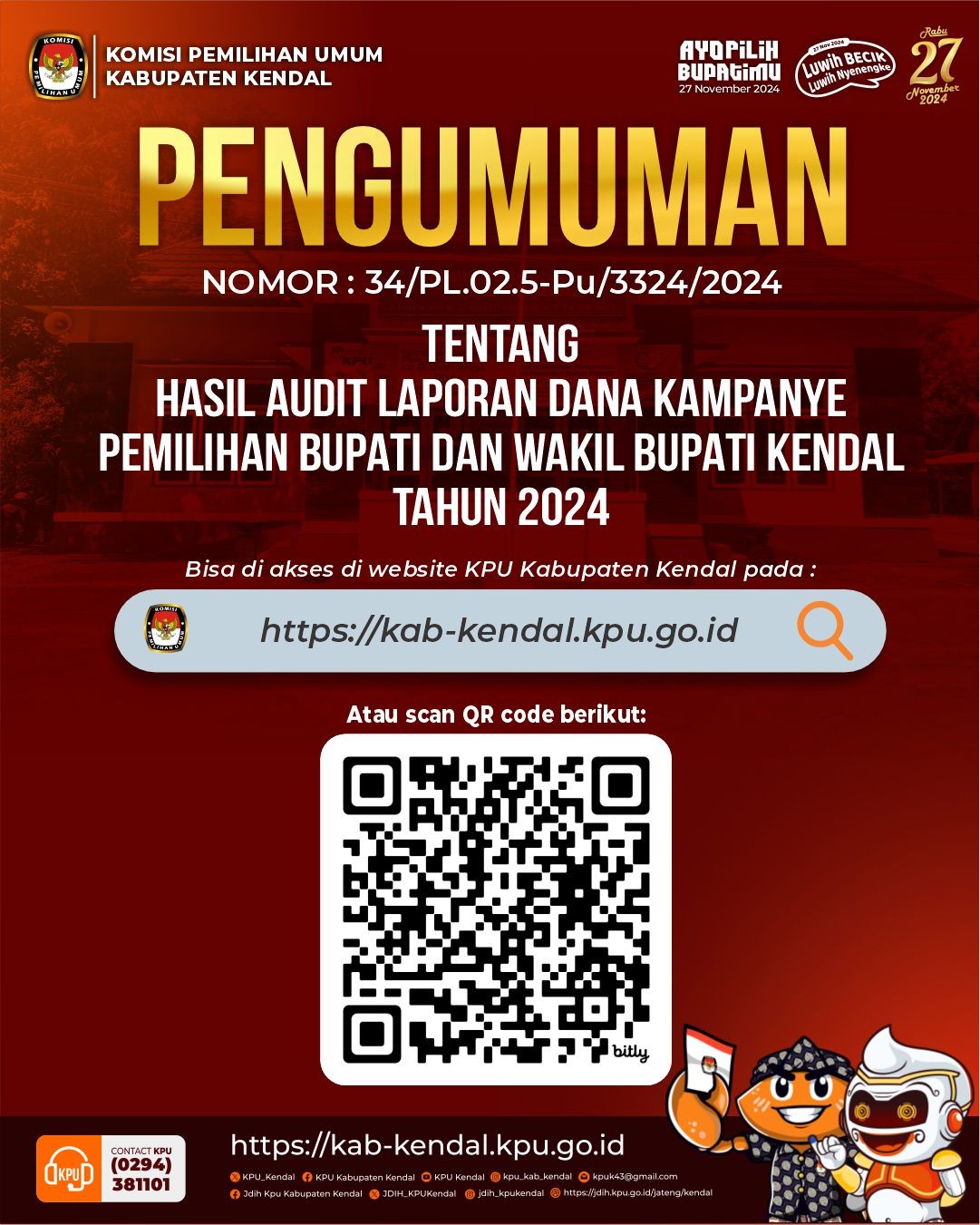 PENGUMUMAN NOMOR : 34/PL.02.5-Pu/3324/2024 TENTANG HASIL AUDIT LAPORAN DANA KAMPANYE PEMILIHAN BUPATI DAN WAKIL BUPATI KENDAL TAHUN 2024
