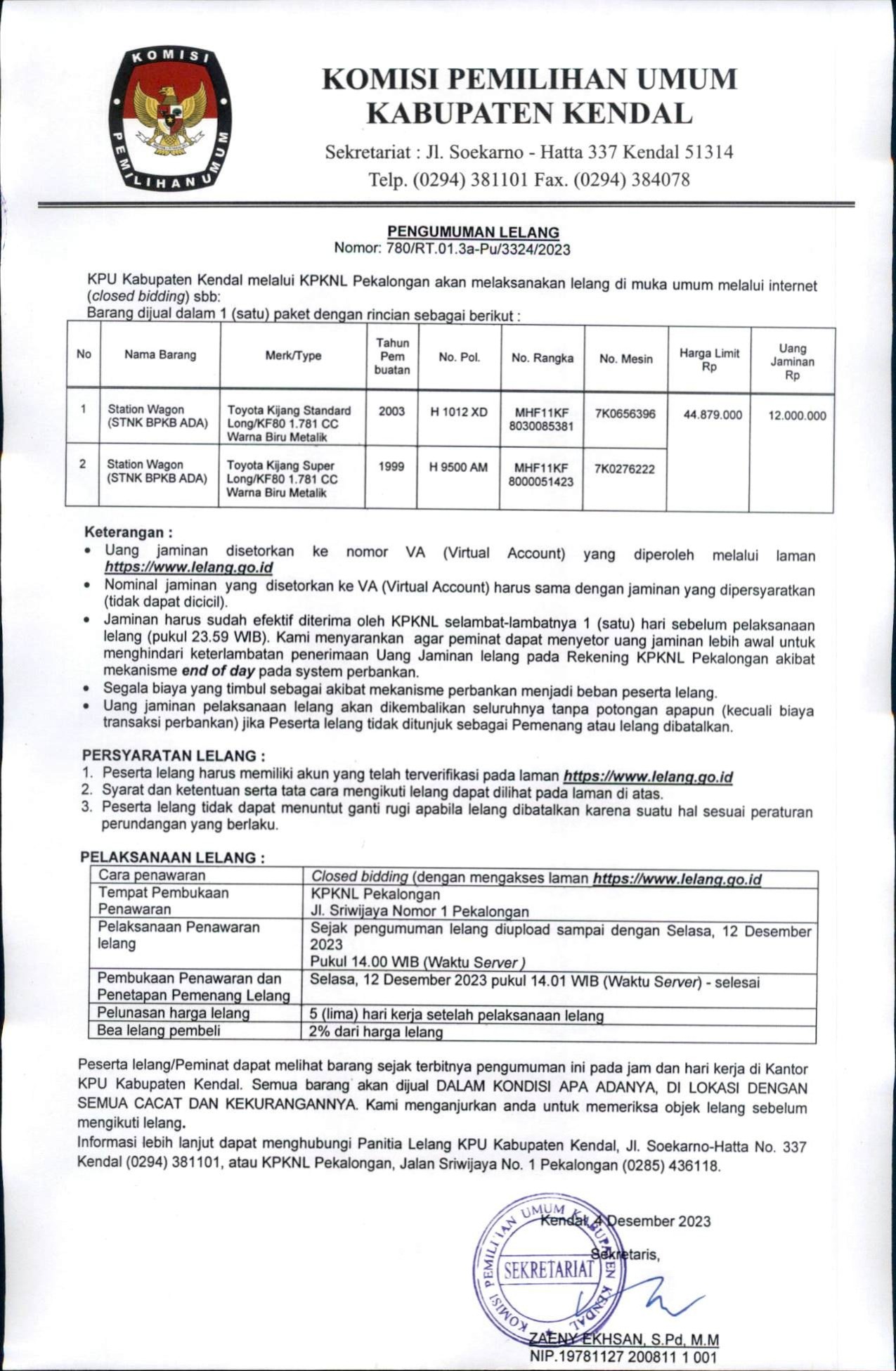 PENGUMUMAN NOMOR 780/RT.01.3a-Pu/3324/2023 LELANG 2 UNIT MOBIL TOYOTA KIJANG