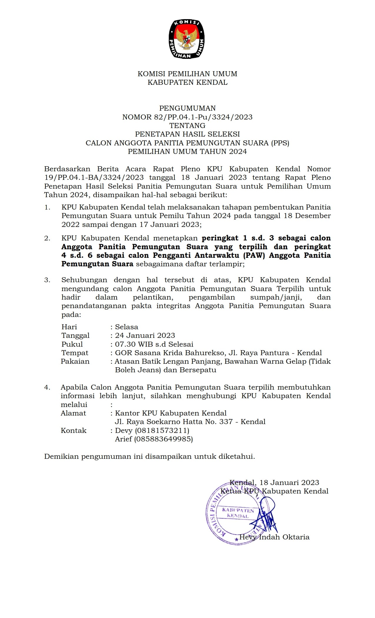 Berdasarkan Berita Acara Rapat Pleno KPU Kabupaten Kendal Nomor 19/PP.04.1-BA/3324/2023 tanggal 18 Januari 2023 tentang Rapat Pleno Penetapan Hasil Seleksi Panitia Pemungutan Suara untuk Pemilihan Umum Tahun 2024, disampaikan hal-hal sebagai berikut: