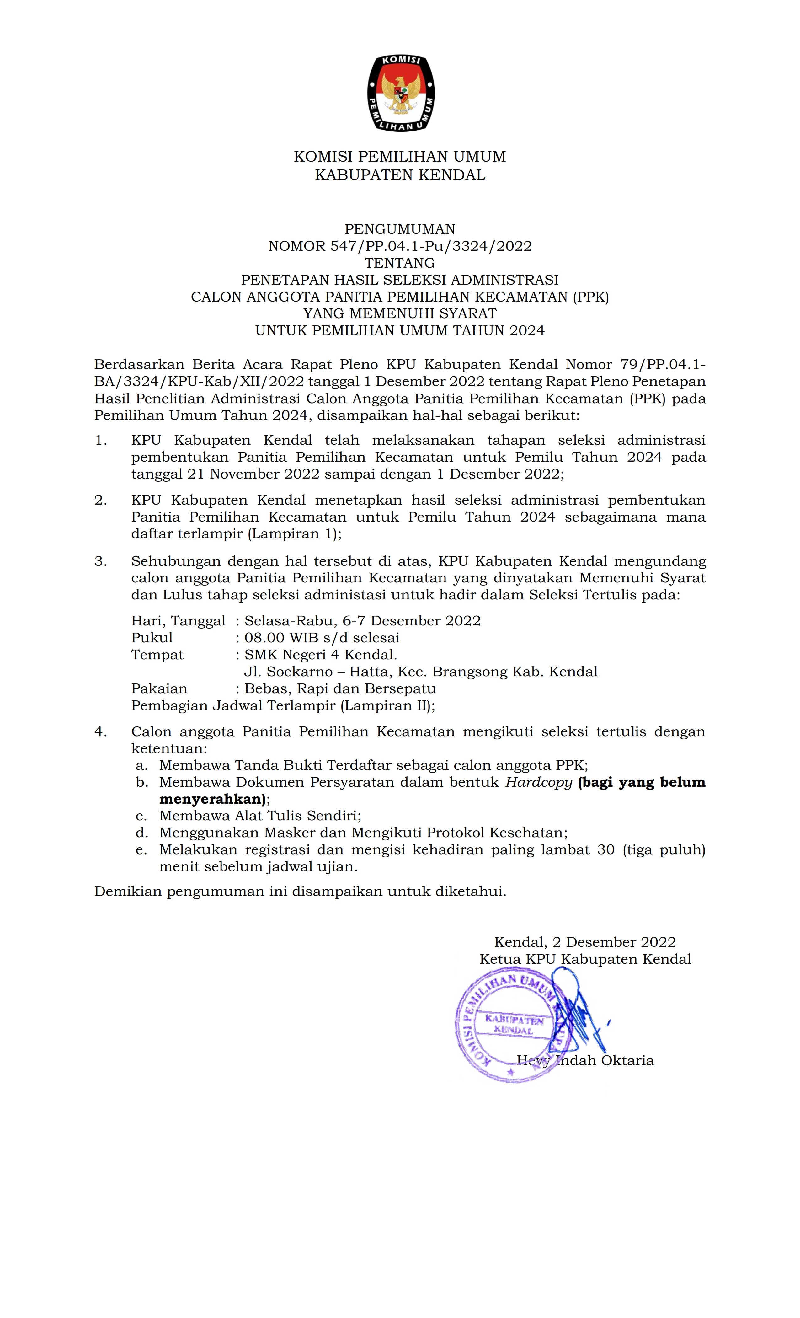 Berdasarkan Berita Acara Rapat Pleno KPU Kabupaten Kendal Nomor 79/PP.04.1- BA/3324/KPU-Kab/XII/2022 tanggal 1 Desember 2022 tentang Rapat Pleno Penetapan Hasil Penelitian Administrasi Calon Anggota Panitia Pemilihan Kecamatan (PPK) pada Pemilihan Umum Tahun 2024, disampaikan hal-hal sebagai berikut:
