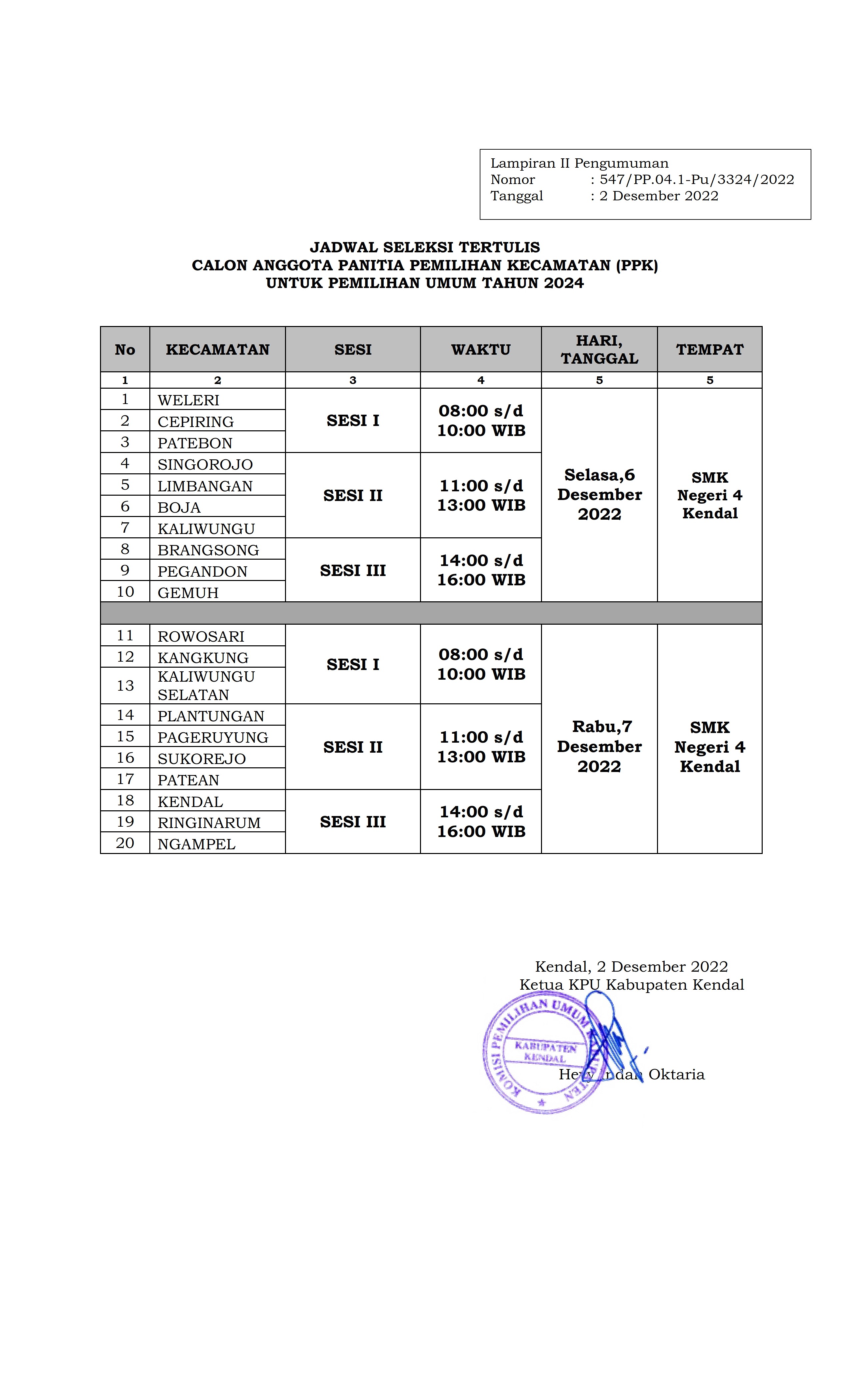 Sesuai dengan Pengumuman KPU Kabupaten Kendal NOMOR: NOMOR 547/PP.04.1-Pu/3324/2022 TENTANG PENETAPAN HASIL SELEKSI ADMINISTRASI CALON ANGGOTA PANITIA PEMILIHAN KECAMATAN (PPK) YANG MEMENUHI SYARAT UNTUK PEMILIHAN UMUM TAHUN 2024 .