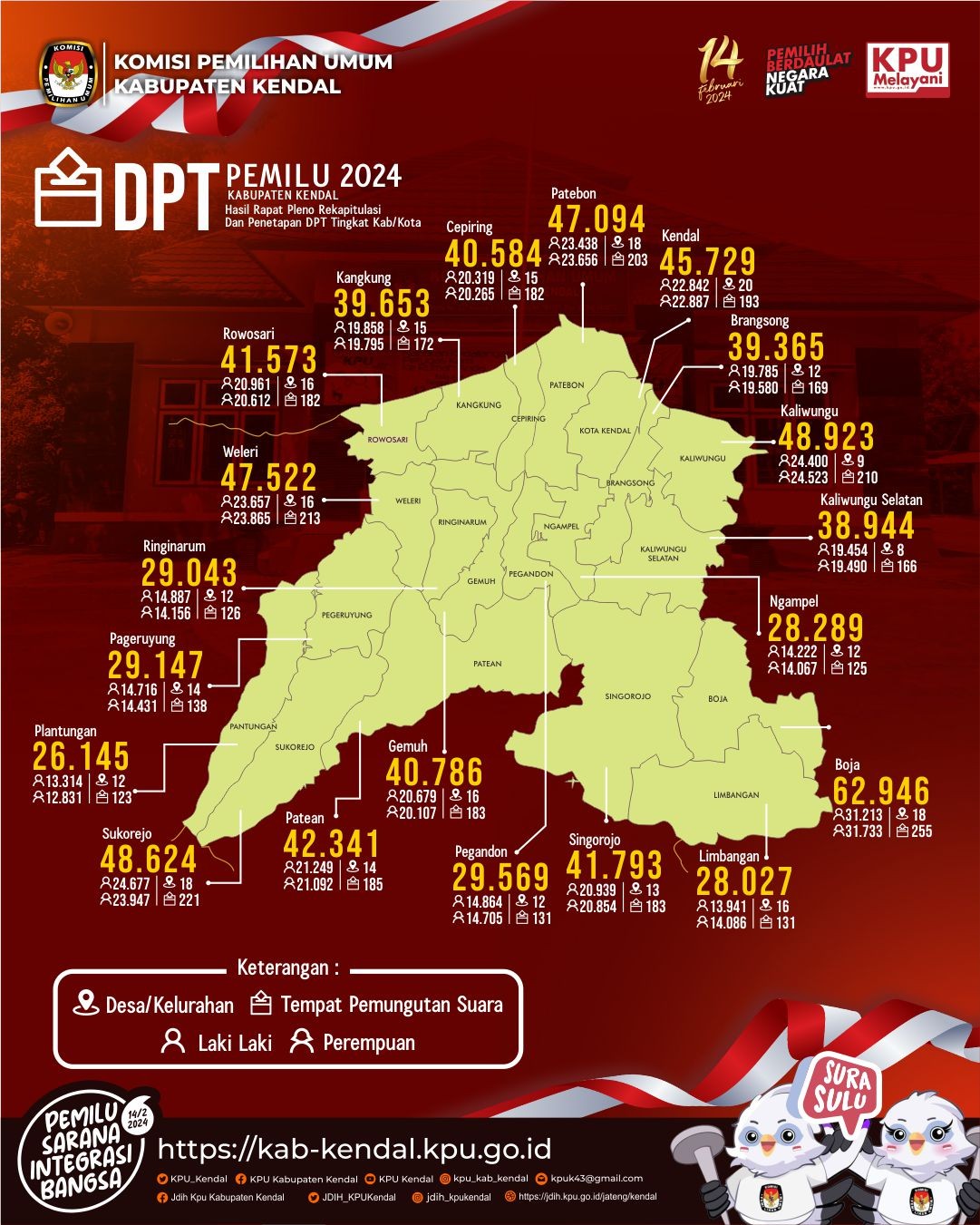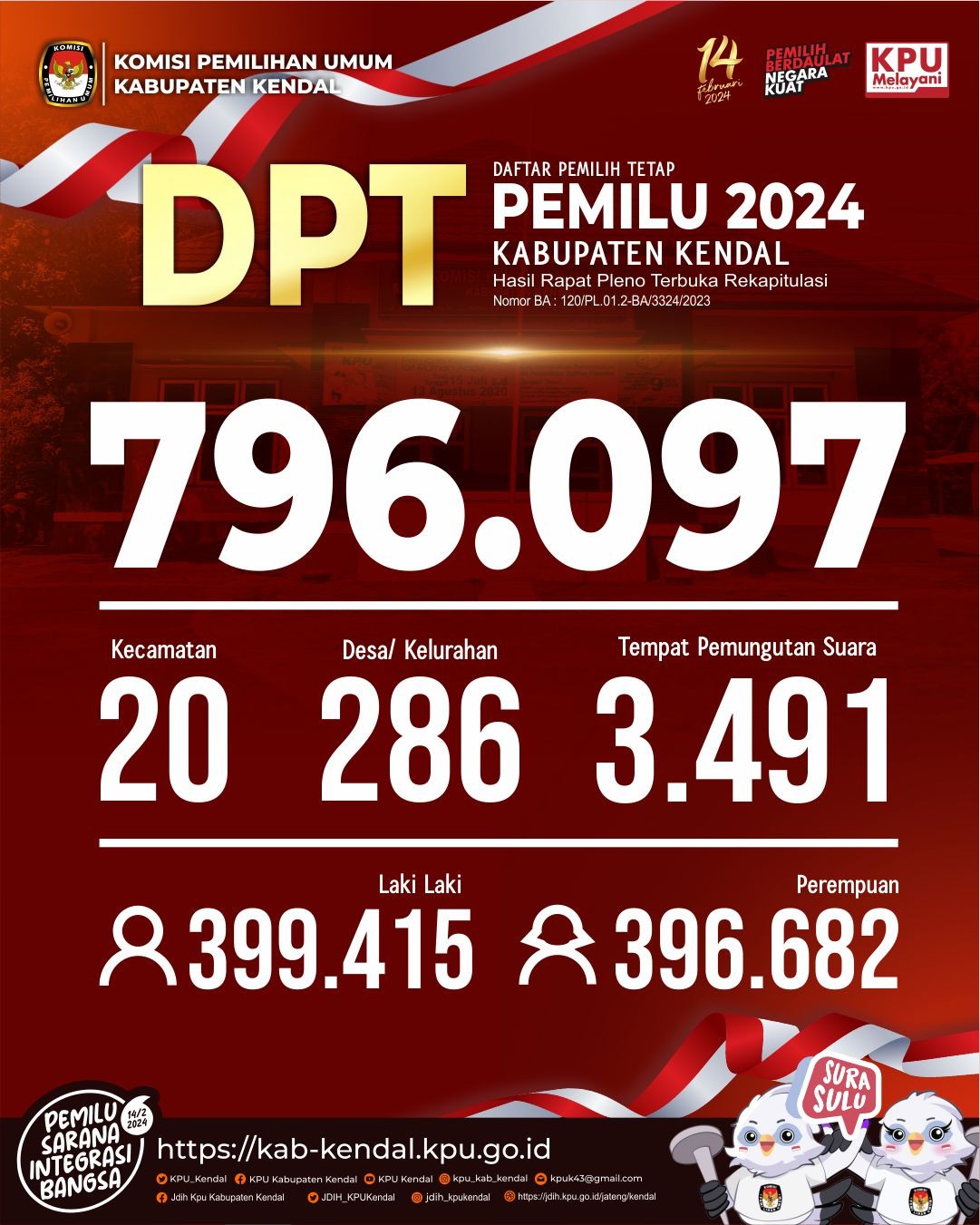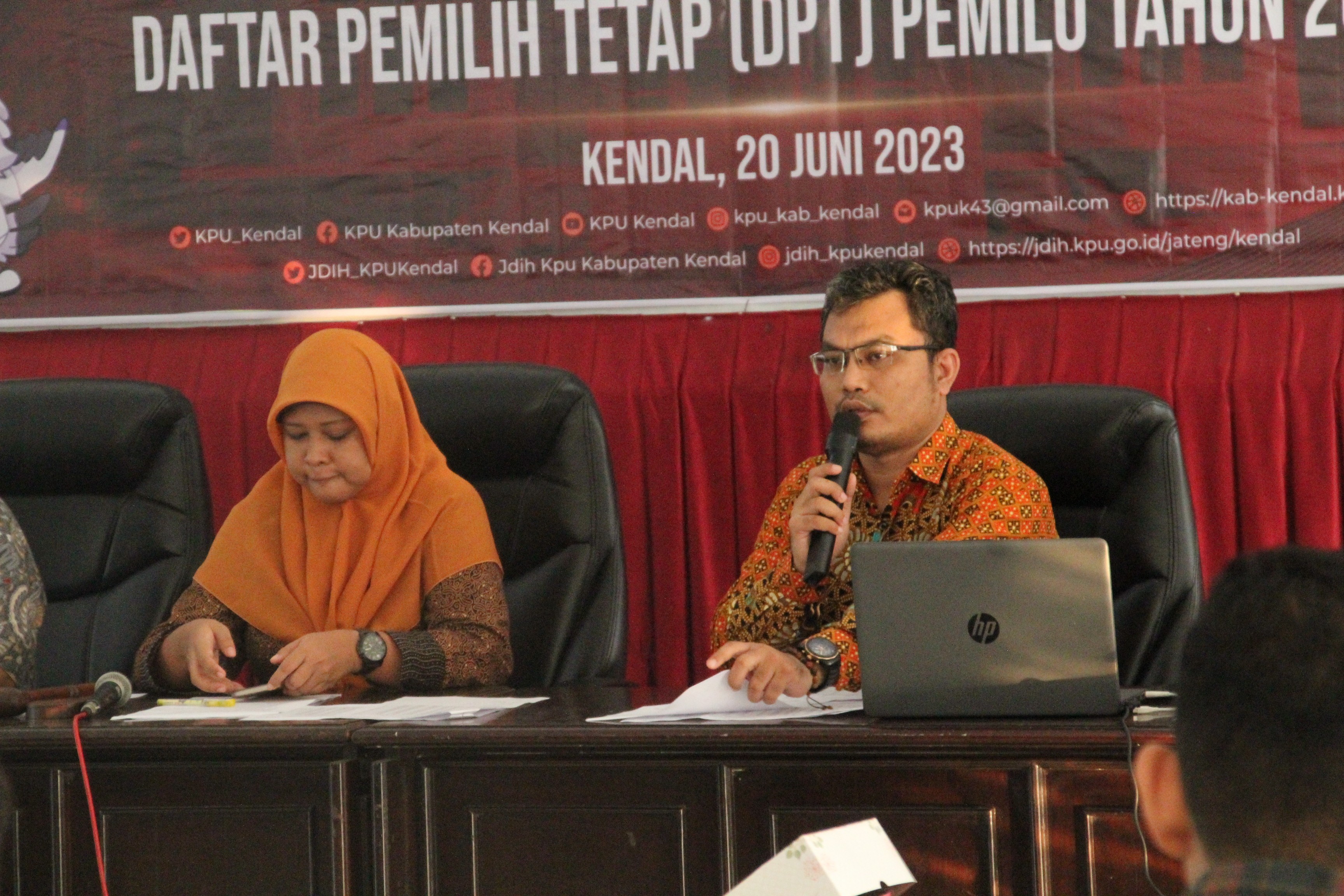 KPU Kabupaten Kendal telah melaksanakan Rapat Pleno Terbuka Rekapitulasi dan Penetapan Daftar Pemilih Tetap (DPT) pada hari Selasa, 20 Juni 2023 di tingkat KPU Kabupaten Kendal untuk Pemilu Tahun 2024. Pada rapat tersebut, KPU Kabupaten Kendal mengundang PPK se kabupaten Kendal, Bawaslu Kendal, Kapolres Kendal, Dandim 0715 Kendal dan dan 8 stakeholder lainnya. Dalam rapat pleno ini, telah ditetapkan Daftar Pemilih Tetap (DPT) Kabupaten Kendal dengan rincian sebagai berikut; terdapat 20 (dua puluh) kecamatan dengan jumlah desa 286 (dua ratus delapan puluh enam) desa, jumlah TPS 3.491 (tiga ribu empat ratus sembilan puluh satu) TPS, terdiri dari 3.485 (tiga ribu empat ratus delapan puluh lima) TPS regular dan 6 (enam) TPS Lokasi Khusus. Jumlah pemilih laki-laki 399.415 (tiga ratus sembilan puluh sembilan ribu empat ratus lima belas) pemilih, pemilih perempuan 396.682 (tiga ratus sembilan puluh enam ribu enam ratus delapan puluh dua) pemilih, jumlah pemilih laki-laki dan perempuan 796.097 (tujuh ratus sembilan puluh enam ribu sembilan puluh tujuh) pemilih.
