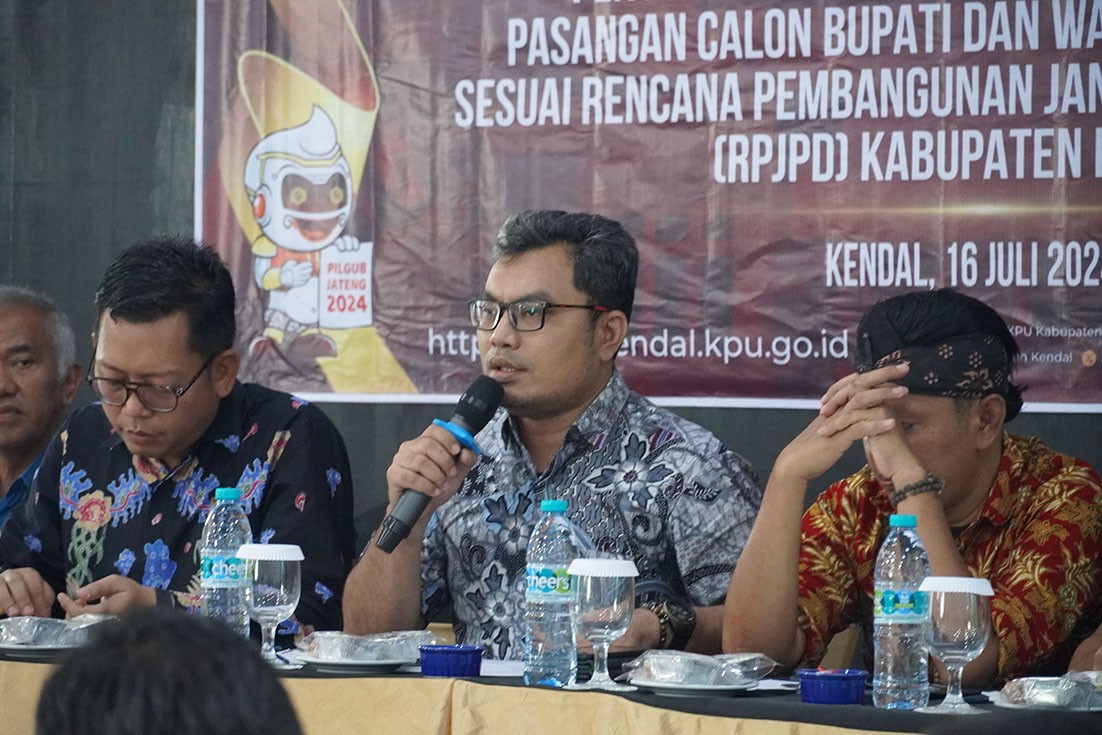 Pada Selasa, 16 Juli 2024 KPU Kabupaten Kendal melaksanakan Sosialisasi Penyusunan Visi, Misi dan Program Bakal Pasangan Calon Bupati dan Wakil Bupati Kendal Sesuai Rencana Pembangunan Jangka Panjang Daerah (RPJPD) Kabupaten Kendal. Dalam sosialisasi yang bertempat di SatuKata Eatery & Roastery Jambearum Kendal ini KPU Kabupaten Kendal mengundang Kapolres Kendal, Dandim 0715 Kendal, Kepala Kejaksaan Negeri Kabupaten Kendal, Korwil BIN Daerah Kabupaten Kendal, dan seluruh ketua partai politik peserta pemilu 2024 tingkat kabupaten Kendal. Acara dibuka dengan sambutan dari bapak Akhmad Zaenutolibin yang menyampaikan maksud dan tujuan diselenggarakannya sosialisasi ini. Sebagai narasumber dalam sosialisasi ini adalah Bapak Ir. Sapto Setiawan dari Baperlitbang Kabupaten Kendal dan Bapak M. Bahrul Amik dari Bawaslu Kabupaten Kendal. Bapak Ir. Sapto Setiawan menyampaikan Rencana Pembangunan Jangka Panjang Daerah (RPJPD) Kabupaten Kendal 2025-2045 ini bisa menjadi acuan para calon kepala daerah dan wakil kepala daerah dalam Menyusun visi dan misi. Selain itu juga menjadi acuan dalam menyusun program pada pemilihan kepala daerah yang akan disampaikan kepada masyarakat baik secara lisan maupun tertulis saat kampanye. Dari Bawaslu Kabupaten Kendal, bapak M. Bahrul Amik menyampaikan terkait visi misi pasangan calon Bupati dan wakil Bupati Kabupaten Kendal harus sesuai dengan Rencana Pembangunan Jangka Panjang Daerah. Peran Bawaslu dalam hal ini adalah melakukan pencegahan, pengawasan, penanganan dan penyelesaian sengketa Pemilu Dengan harapan Pilkada serentak 2024 berjalan dengan tertib, aman, damai, bermartabat dan berkualitas. Sosialisasi ditutup dengan sesi tanya jawab antara peserta dengan narasumber.