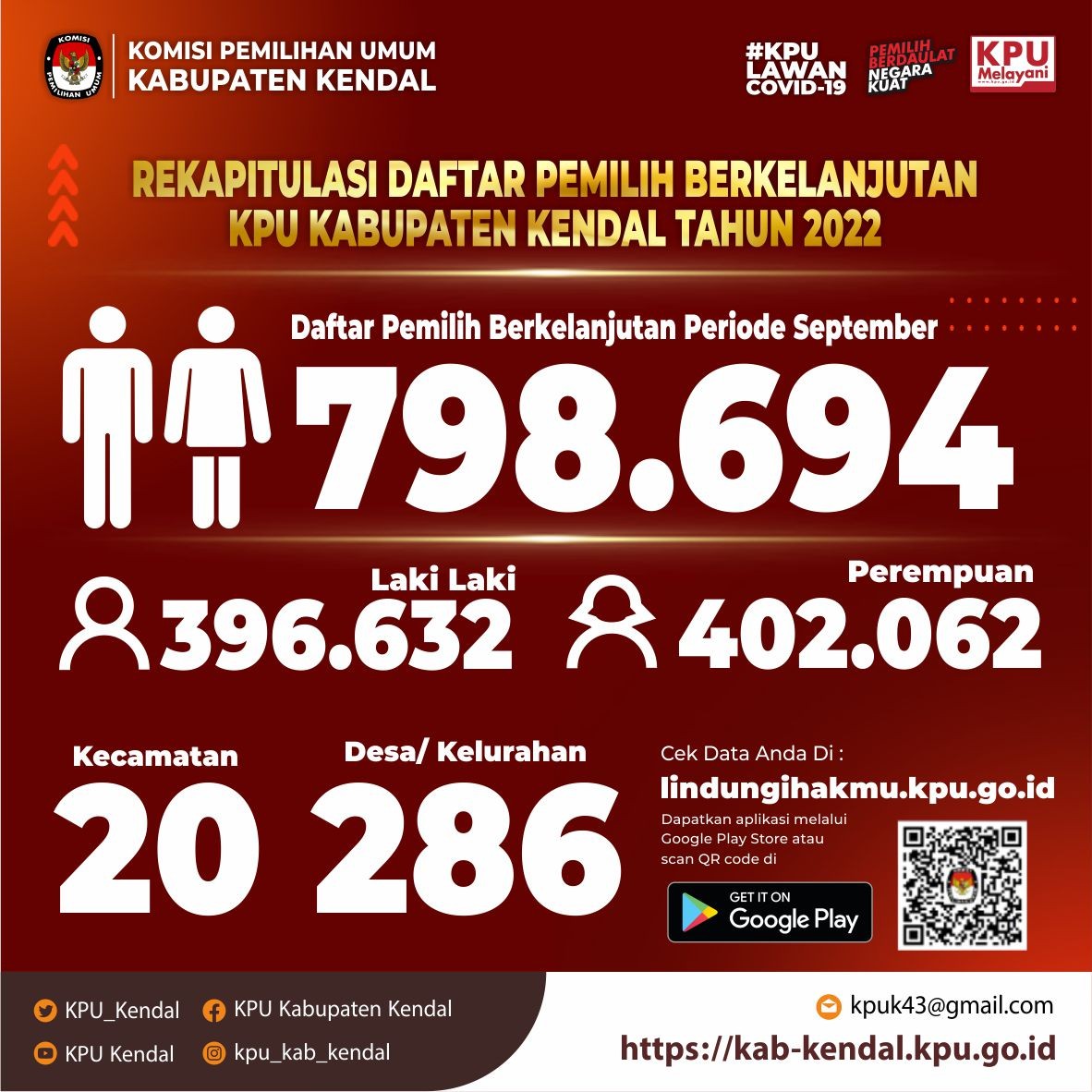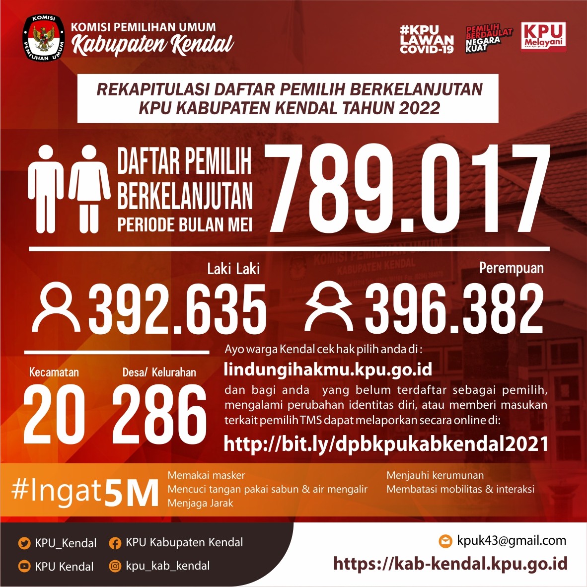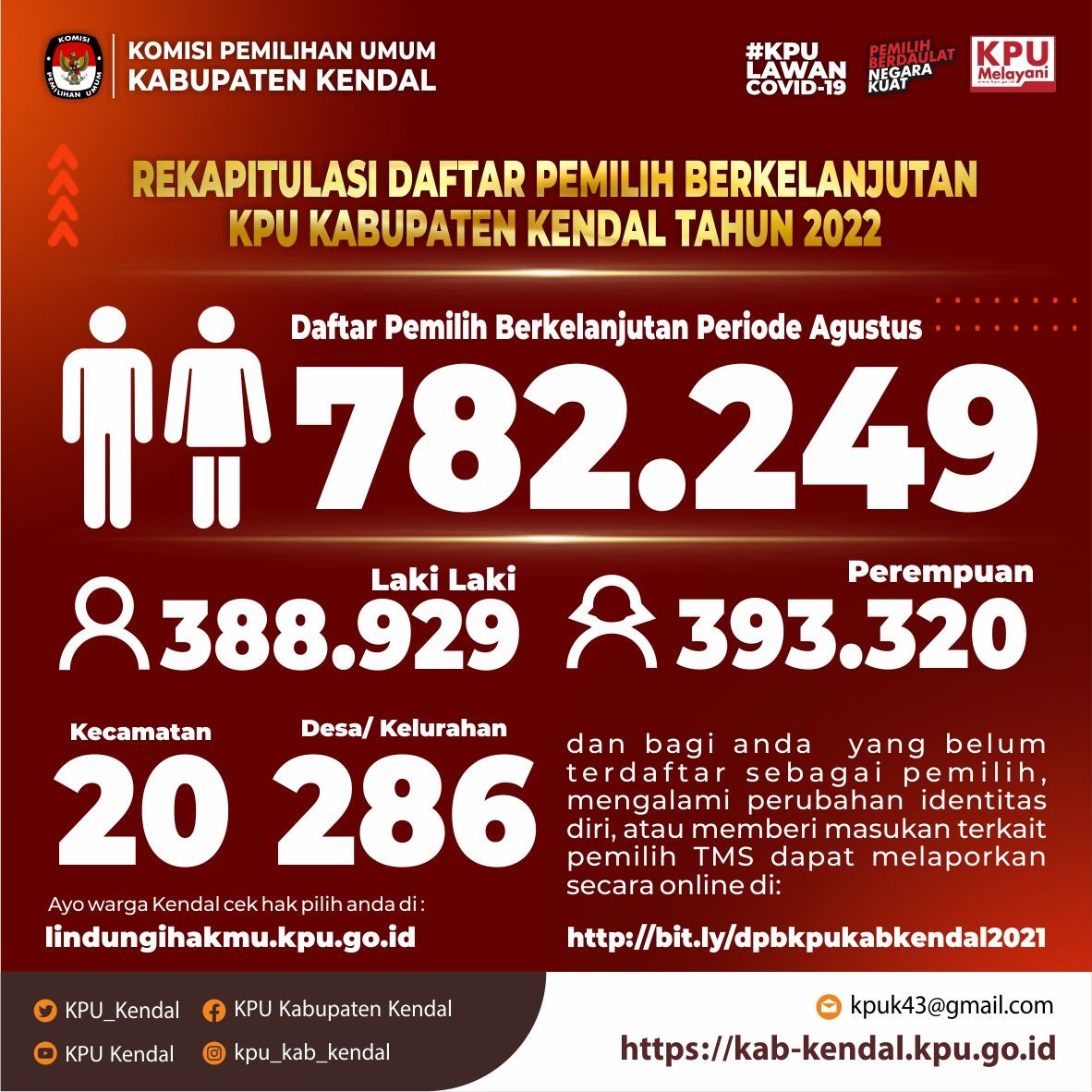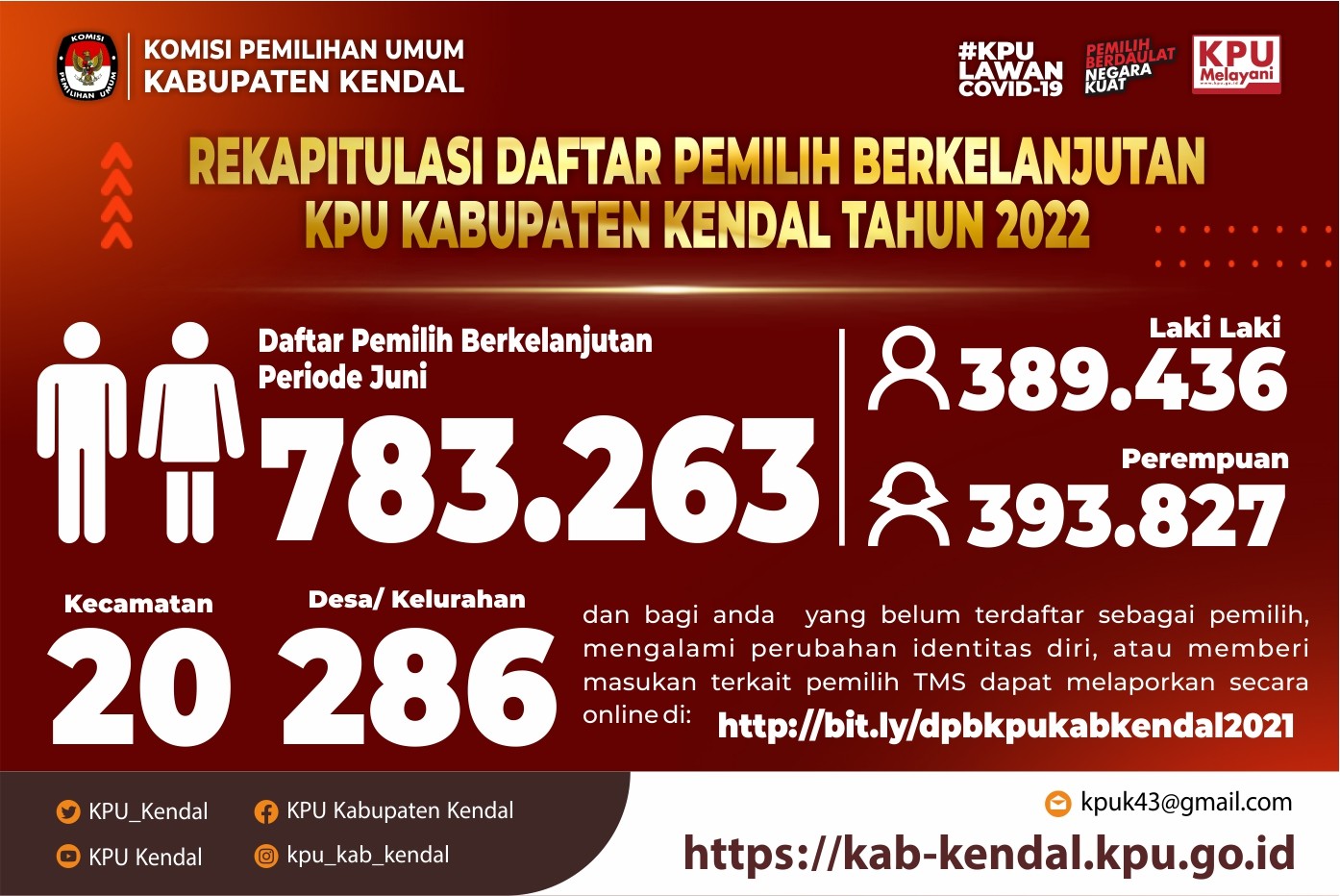 KPU Kabupaten Kendal melaksanakan Rapat Pleno Penetapan Daftar Pemilih Berkelanjutan bulan Agustus 2022 pada Selasa, 30 Agustus 2022. Bertempat di Aula KPU Kabupaten Kendal dengan dihadiri Plh Ketua, Anggota dan Struktural KPU Kabupaten Kendal. Daftar Pemilih Berkelanjutan (DPB) bulan Agustus 2022 sebanyak 782.249 pemilih dengan rincian 388.929 pemilih laki-laki dan 393.320 pemilih perempuan. Bagi masyarakat Kabupaten Kendal silahkan cek hak pilih Anda di Lindungi Hakmu mobile yg dapat diunduh di playstore ponsel android atau https://lindungihakmu.kpu.go.id/ Jika belum terdaftar sebagai pemilih, mengalami perubahan identitas, atau memberikan masukan terkait pemilih yang Tidak Memenuhi Syarat/TMS (meninggal dunia, pindah domisili, menjadi TNI/POLRI, hak pilih dicabut) dapat melapor dengan datang langsung ke kantor KPU Kabupaten Kendal, melalui online di http:bit.ly/dpbkpukabkendal2021 atau aplikasi Lindungi Hakmu mobile bisa unduh di playstore gawai android Anda atau ke laman lindungihakmu.kpu.go.id #KPUKendal #KPUMelayani #DPBAgustus2022 #TahapanPemilu2024 #TahapanPemilihan2024