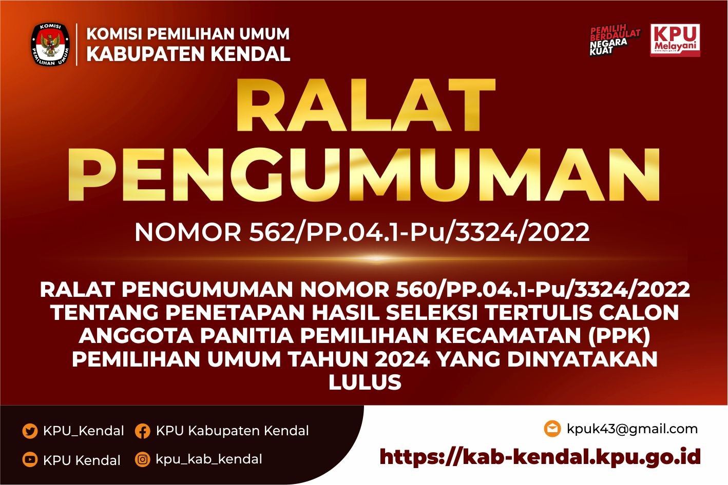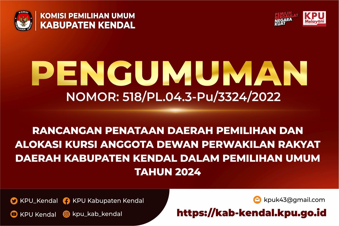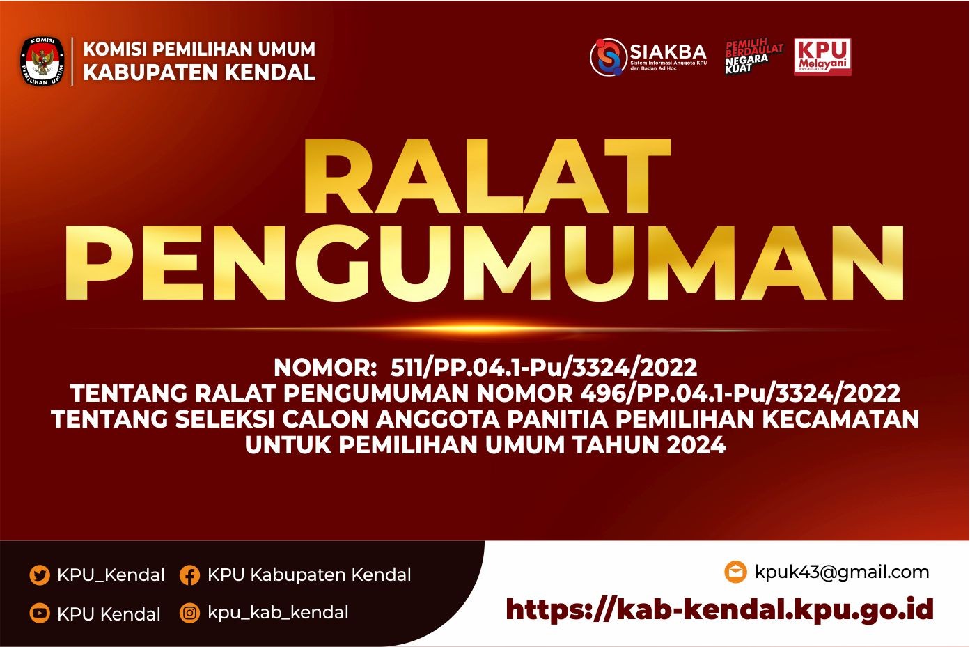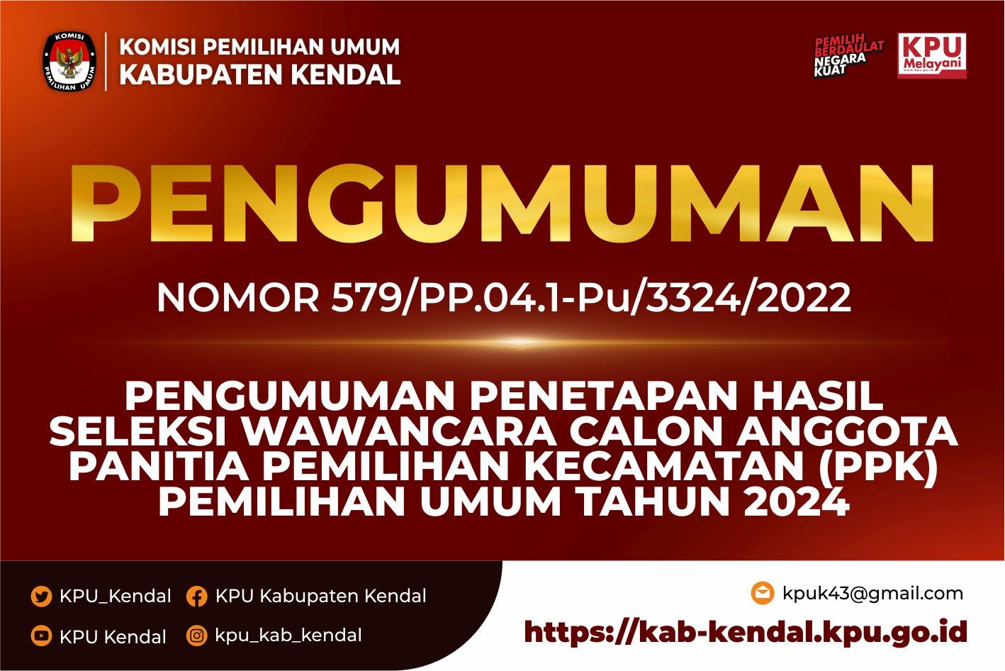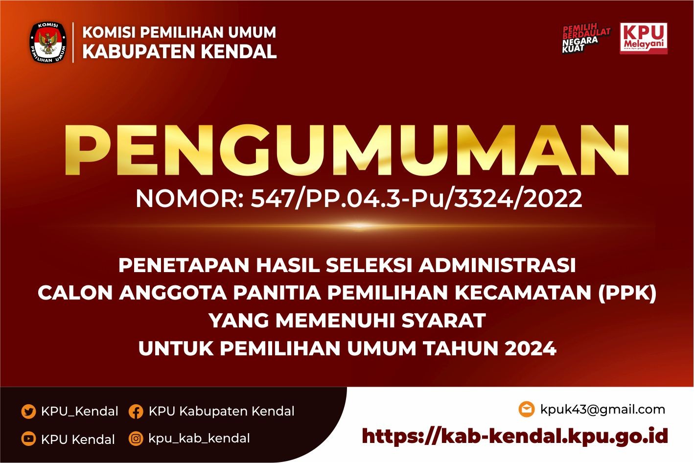Sesuai dengan Pengumuman KPU Kabupaten Kendal NOMOR: 496/PP.04.1-Pu/3324/2022 Dalam rangka pembentukan Panitia Pemilihan Kecamatan (PPK) untuk Pemilihan Umum, Komisi Pemilihan Umum Kabupaten Kendal mengundang Warga Negara Indonesia yang memenuhi persyaratan untuk mendaftarkan diri menjadi anggota Panitia Pemilihan Kecamatan untuk Pemilihan Umum dengan ketentuan sebagai berikut: