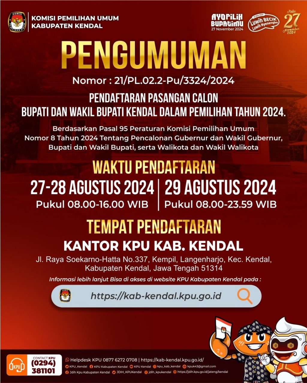 Waktu dan Tempat Pendaftaran Pasangan Calon Bupati dan Wakil Bupati Kendal Tahun 2024 sebagai berikut: