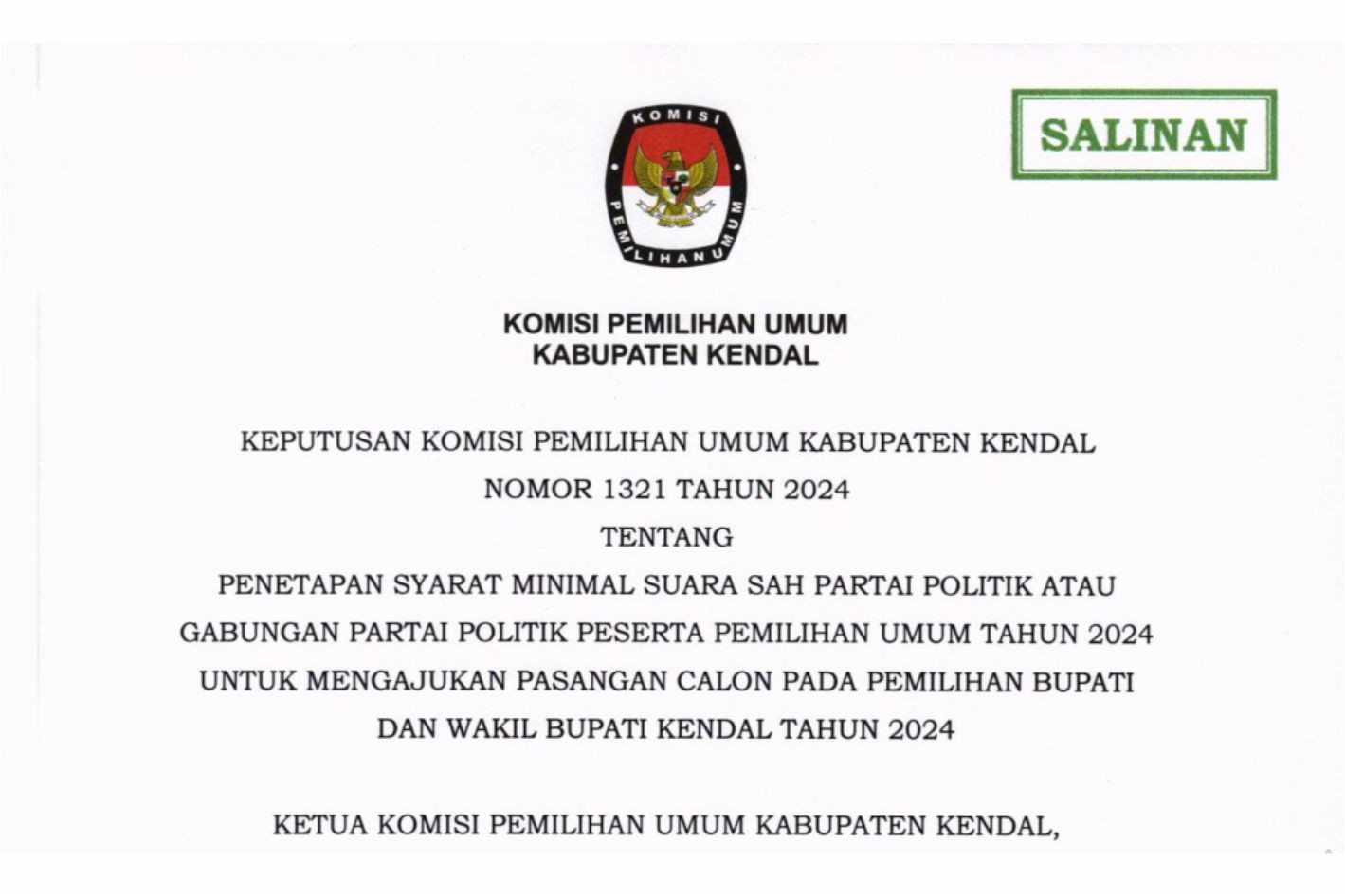 Berdasarkan Keputusan KPU Kabupaten Kendal Nomor 1321 Tahun 2024 mengenai Penetapan Syarat Minimal Suara Sah Partai Politik atau Gabungan Partai Politik Peserta Pemilihan Umum Tahun 2024 untuk Mengajukan Pasangan Calon Pada Pemilihan Bupati dan Wakil Bupati Kendal Tahun 2024 menyatakan syarat minimal suara sah 7,5 % (tujuh koma lima persen) sebanyak 48.059 (empat puluh delapan ribu lima puluh sembilan) suara: