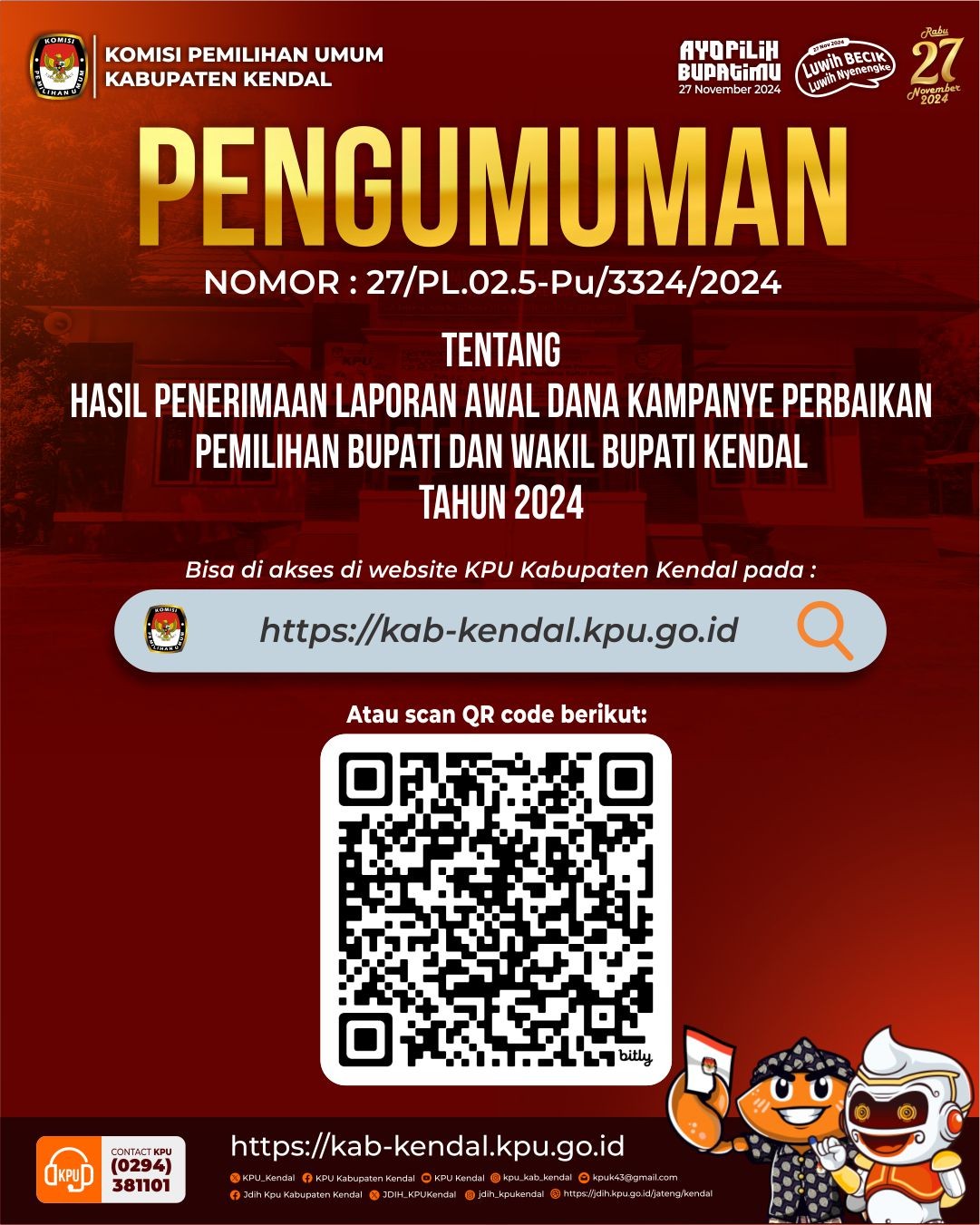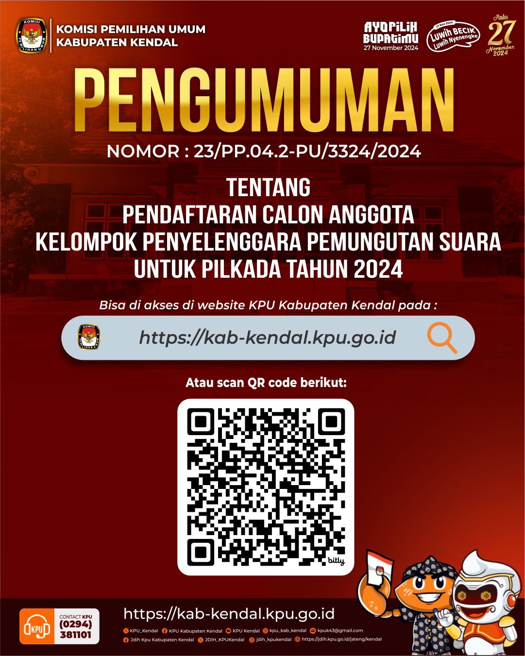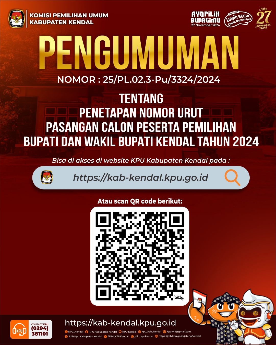 Bahwa untuk melaksanakan ketentuan Pasal 95 ayat (1) Peraturan Komisi Pemilihan Umum Nomor 8 Tahun 2024 tentang Pencalonan Gubernur dan Wakil Gubernur, Bupati dan Wakil Bupati, serta Walikota dan Wakil Walikota, Komisi Pemilihan Umum Kabupaten Kendal mengumumkan Pendaftaran Pasangan Calon Bupati dan Wakil Bupati Kendal Tahun 2024 sebagai berikut: