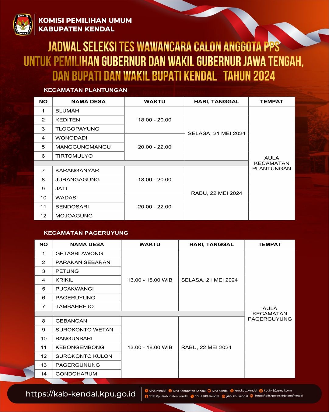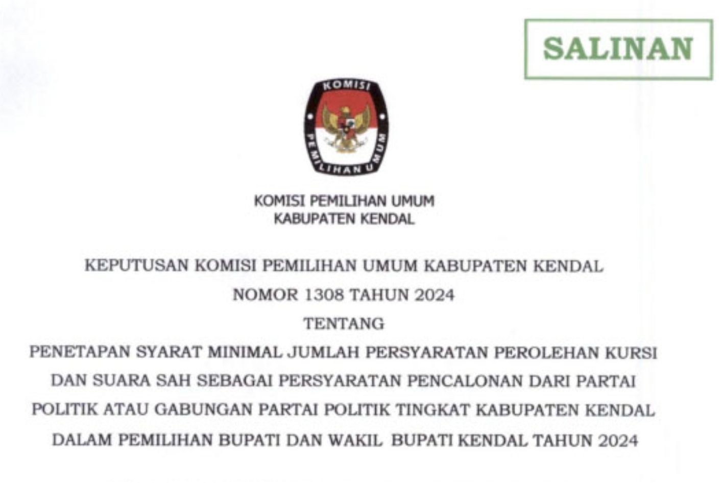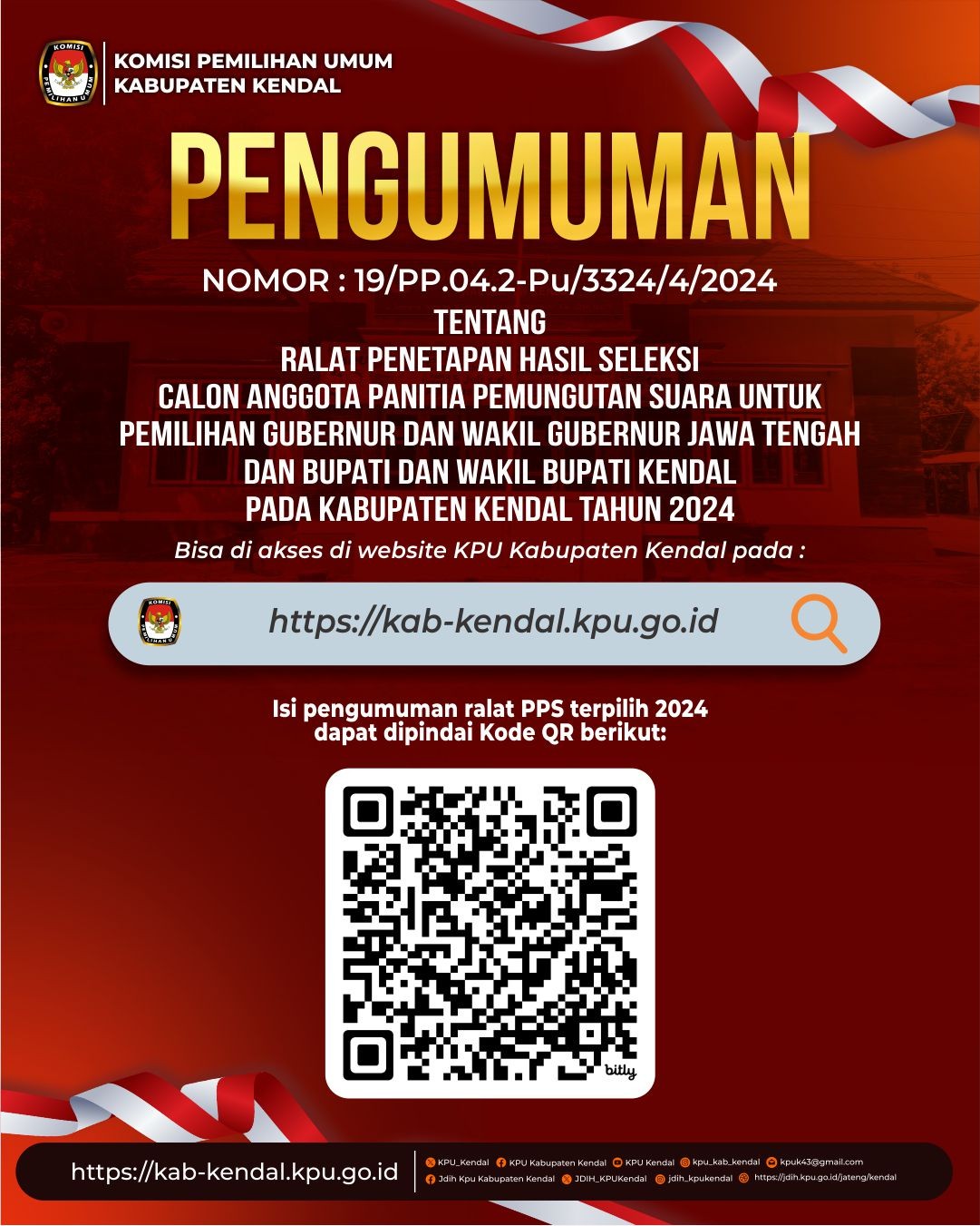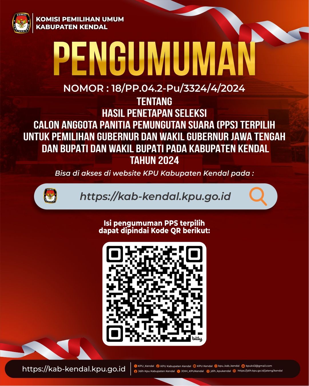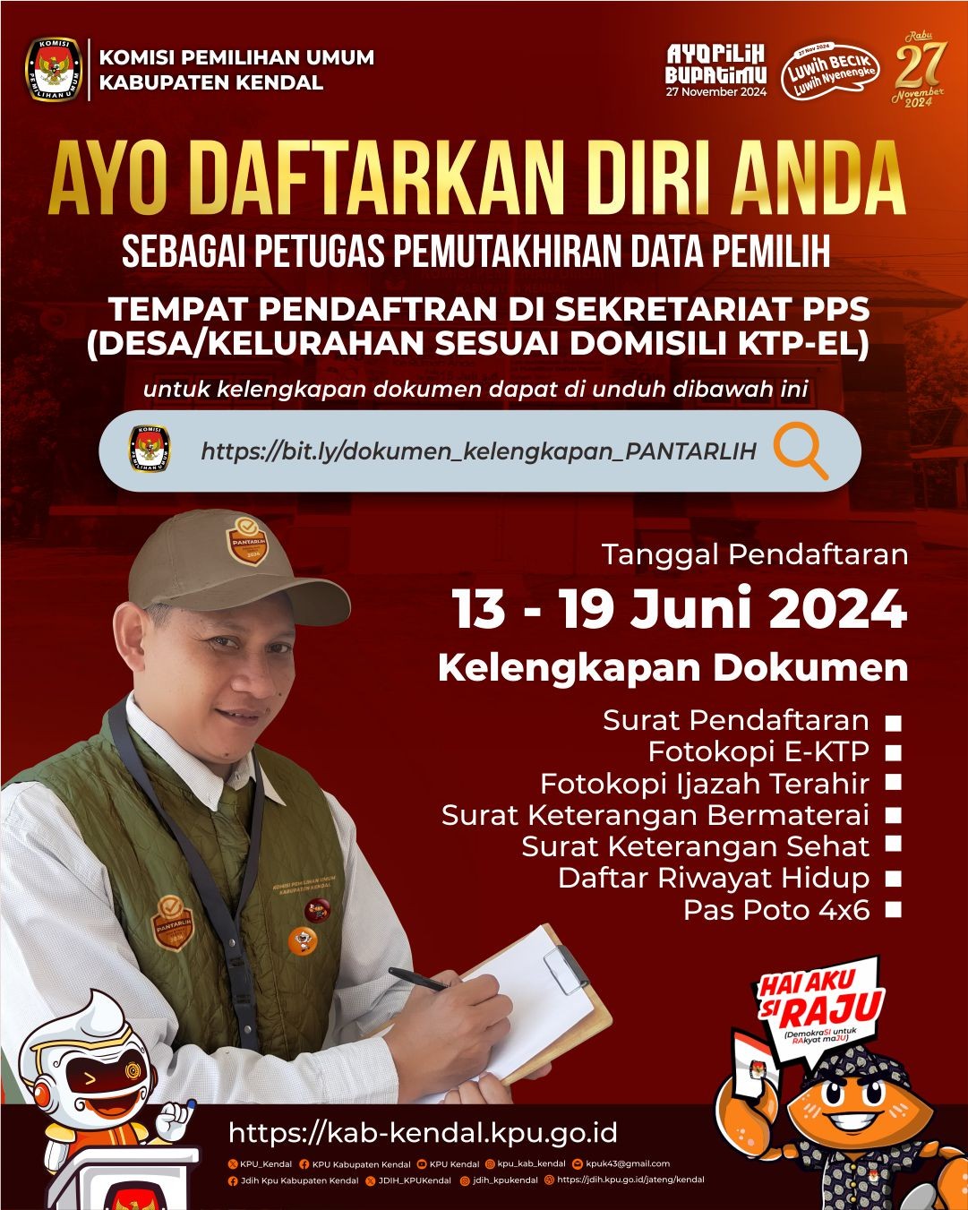 Dalam rangka pembentukan Calon Petugas Pemutakhiran Data Pemilih untuk Pemilihan Gubernur dan Wakil Gubernur Jawa Tengah serta Bupati dan Wakil Bupati Kendal Tahun 2024, Komisi Pemilihan Umum Kabupaten Kendal mengundang Warga Negara Indonesia yang memenuhi kualifikasi untuk mendaftarkan diri menjadi Pantarlih dengan ketentuan sebagai berikut: Persyaratan Pantarlih: Warga Negara Indonesia; berusia paling rendah 17 (tujuh belas) tahun; tidak menjadi anggota Partai Politik yang dinyatakan dengan surat pernyataan yang sah, atau paling singkat 5 (lima) tahun tidak lagi menjadi anggota partai politik yang dibuktikan dengan surat keterangan dari pengurus partai politik yang bersangkutan; berdomisili dalam wilayah kerja; mampu secara jasmani dan rohani; dan berpendidikan paling rendah sekolah menengah atas atau sederajat; Kelengkapan Dokumen Persyaratan: Surat pendaftaran sebagai calon Pantarlih; Fotokopi Kartu Tanda Penduduk untuk persyaratan huruf a dan huruf b; Fotokopi ijazah sekolah menengah atas/sederajat atau ijazah terakhir untuk persyaratan huruf f; Surat pernyataan untuk persyaratan huruf c dan e, merupakan satu dokumen surat pernyataan sebagaimana tercantum dalam Lampiran; Surat keterangan sehat jasmani untuk persyaratan huruf e yang dikeluarkan oleh puskesmas, rumah sakit, atau klinik yang termasuk di dalamnya terdapat pemeriksaan tekanan darah, kadar gula darah, dan kolesterol atau pernyataan sehat secara jasmani; Daftar Riwayat Hidup sebagaimana tercantum dalam Lampiran; Pas Foto Berwarna 4x6. surat keterangan partai politik mengacu pada ketentuan masing-masing partai politik bagi calon Pantarlih yang tidak lagi menjadi anggota partai politik paling singkat 5 (lima) tahun;*) dan surat pernyataan bermeterai yang memuat informasi bahwa nama dan identitas calon Pantarlih digunakan oleh partai politik tanpa sepengetahuan yang bersangkutan bagi calon Pantarlih yang nama dan identitasnya digunakan oleh partai politik tanpa sepengetahuan yang bersangkutan.**) *) hanya bagi calon Pantarlih yang pernah menjadi anggota partai politik. **) hanya bagi calon Pantarlih yang namanya terdaftar sebagai anggota partai politik tanpa sepengatahuan yang bersangkutan. Pembentukan Petugas Pemutakhiran Data Pemilih untuk Pemilihan Gubernur dan Wakil Gubernur Jawa Tengah serta Bupati dan Wakil Bupati Kendal Tahun 2024 tidak dipungut biaya dan apabila kemudian ditemukan adanya pungutan, masyarakat dapat melaporkan kepada KPU Kabupaten Kendal. Kelengkapan dokumen dapat disampaikan kepada PPS di wilayah masing-masing, yang beralamat di Kantor Desa/Kelurahan di wilayah Kabupaten Kendal. Untuk kelengkapan dokumen dapate di unduh DISINI