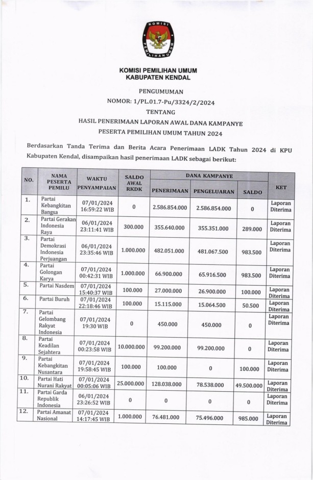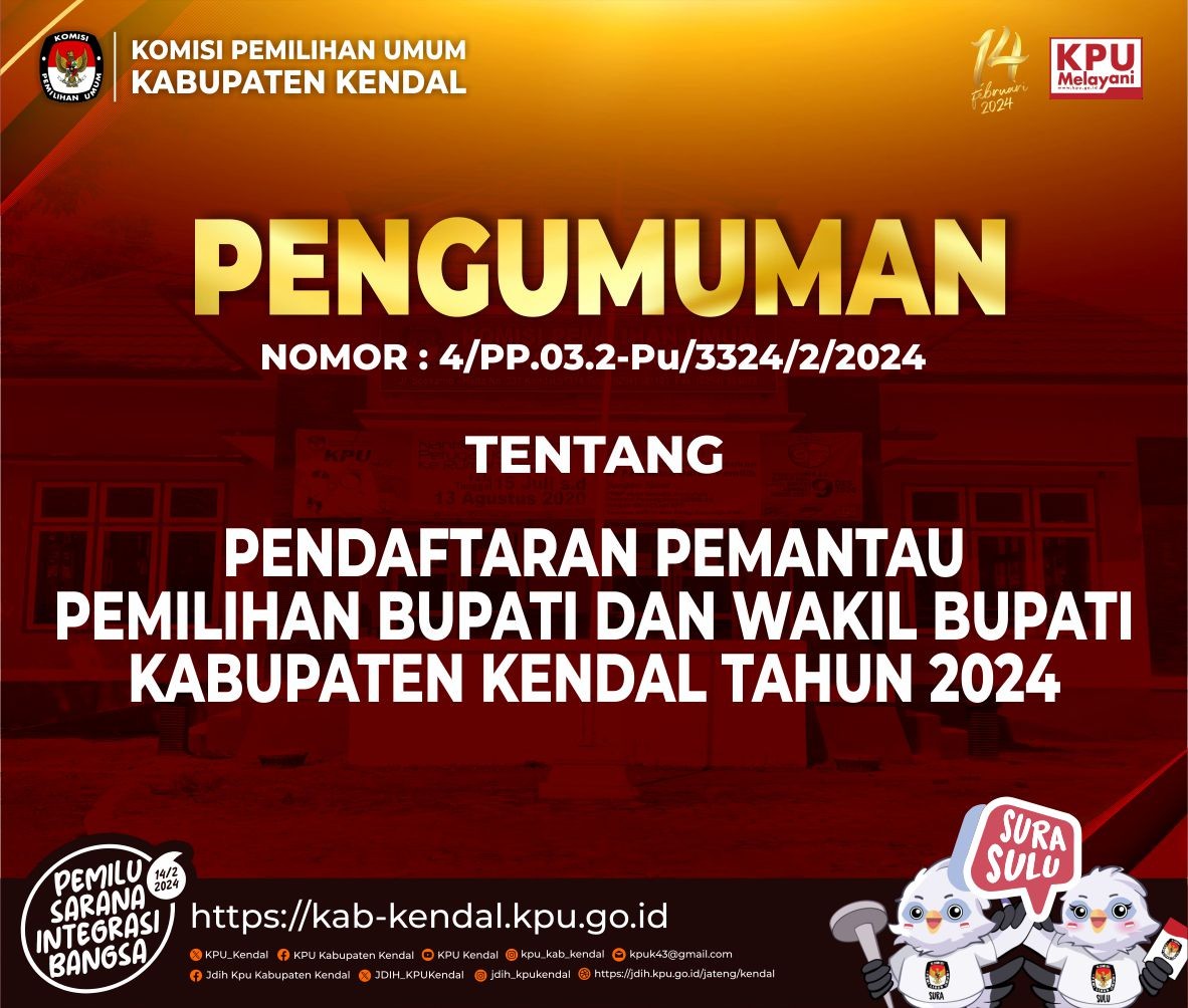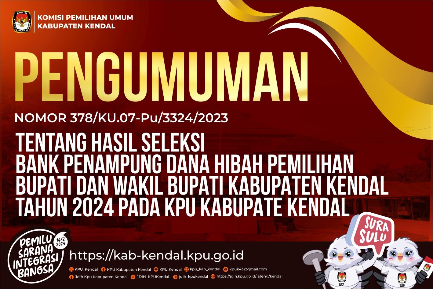 Komisi Pemilihan Umum Kabupaten Kendal mengumumkan bahwa Bank yang ditunjuk sebagai Penampung Dana Hibah Pemilihan Bupati dan Wakil Bupati Kabupaten Kendal Tahun 2024 pada Komisi Pemilihan Umum Kabupaten Kendal adalah Bank Tabungan Negara (BTN) Cabang Kendal yang beralamat di Jl. Pemuda No.33, Karanggeneng, Pegulon, Kec. Kendal, Kabupaten Kendal, Jawa Tengah 51314.