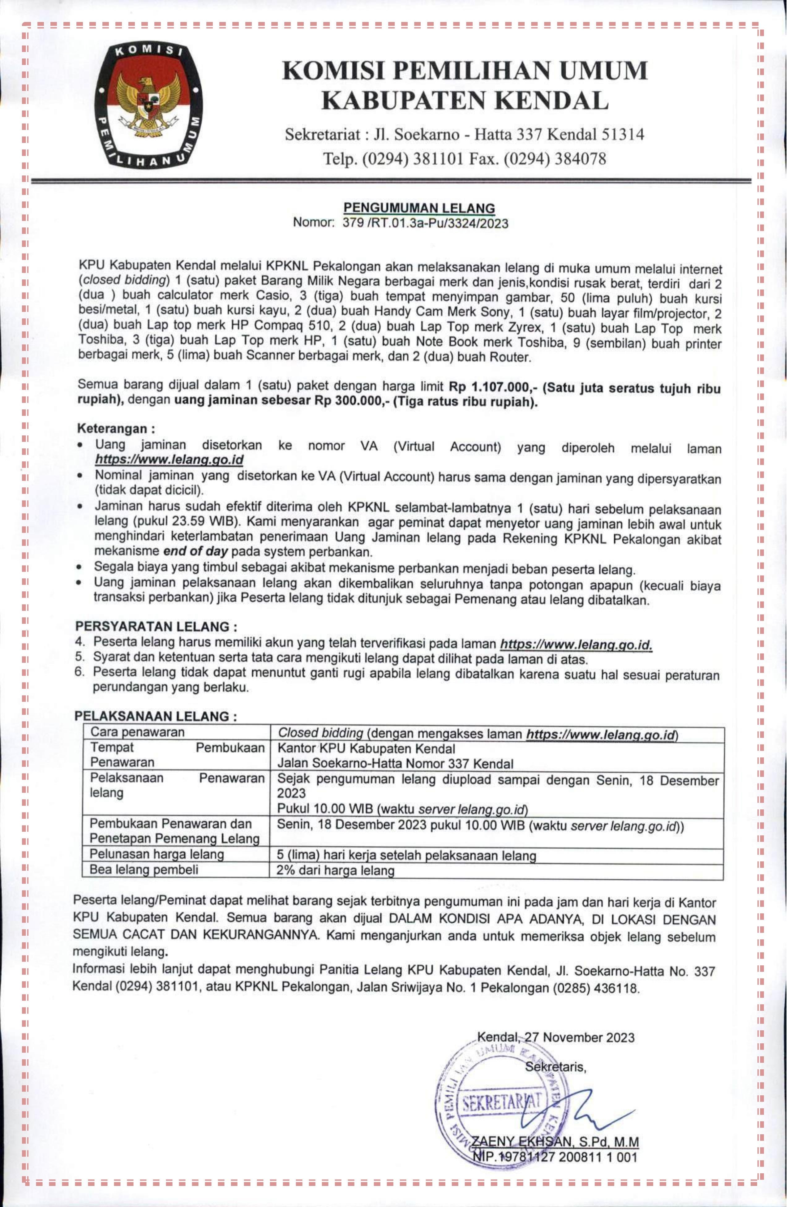 Berita Acara Nomor 7/KU.07-BA/3324/2023 tentang Hasil Seleksi Bank Penampung Dana Hibah Pemilihan Bupati dan Wakil Bupati Kabupaten Kendal Tahun 2024 pada Komisi Pemilihan Umum Kabupaten Kendal.